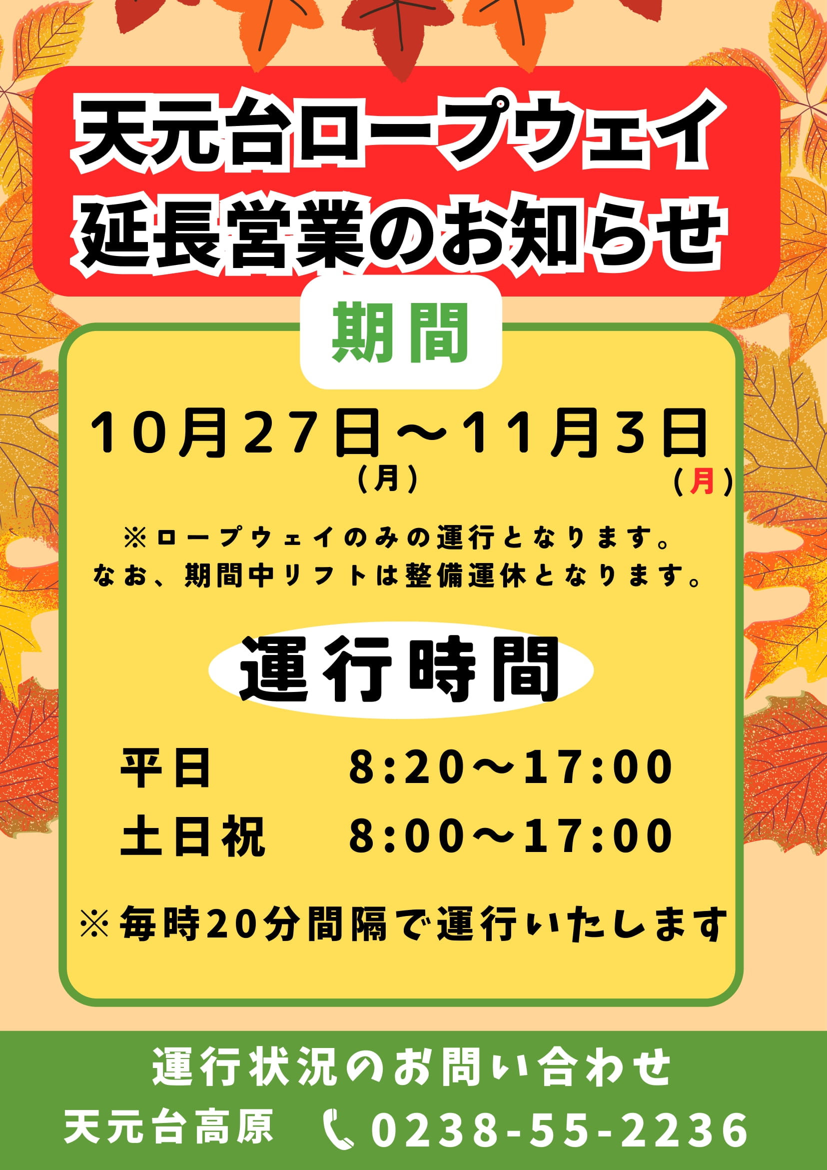 ▼天元台ロープウェイ延長営業のお知らせ2025/10/15 08:32 (C) 米沢観光NAVI|新着情報
