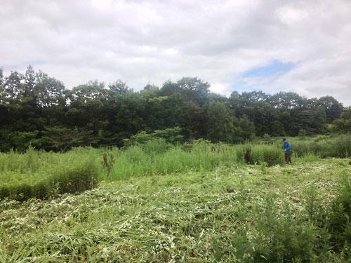 田んぼの全面積に お米を作付出来ればよいのですが、減反政策により全面積の1/3強は、他の物を作付ねばなりません。うちは、米しか作らないよ!とつっぱねると、周囲の農家に その分割り当てがいき迷惑をかける仕組み。我家は、減反地には主に蕎麦を作付しています。蕎麦は、7月末から8月初頭が播き時期。蕎麦を播くには、春から生えている雑草を刈り、トラクターで耕耘しないとなりません。 ところが、ひと月以上降り続いた雨は、そう簡単に耕耘できるほど乾きません。下手にトラクターで入ったら、ぬかるんで出られなくなってしまったり、うまく耕耘できず、泥遊び跡地のようにドロドロボコボコになってしまう可能性が。もう蕎麦の種を100kg以上購入済みだけれど、適期内に播けそうにない。枝豆や とうもろこし、田んぼの 作業もたてこんでいる中で、収量と収益の見込めない蕎麦を播く時間を作るのは、いかがなものだろう。作ってもマイナス。作らなくてもマイナス。場所を選んで、少しでも播くしかないか。 写真は、今 手伝いに来てくれている I くんと、蕎麦用地の草刈りをしているときの図。ここは、減反じゃなく畑地、というか山地というか・・・