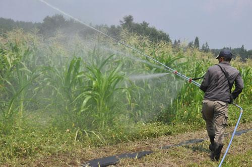 我家で唯一、虫対策の防除をしている「もちとうもろこし」。散布しないと、お客様の家でイモムシがうじゃうじゃ出てきてしまうので、数年前から農薬散布を始めました。普通の殺虫剤を撒くものと、有機JAS対応のBT剤を撒くものの2タイプ。BT剤というのはバチルス・チューリンゲンシスという細菌を使った生物農薬で、蛾など特定の幼虫が食べると腸内で毒素に変わるもの。他の生物に、なるべく害のないものを使いたいので、いづれBT剤だけにしたいと思っています。