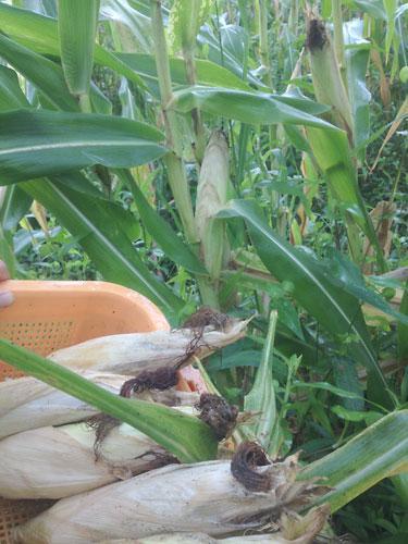 もちとうもろこし、収穫始め!昨日から収穫を始める予定でしたが、折しも小学生の新学期。昨朝は娘の自由研究緊急支援をしているうちに気温が上がってしまい収穫断念。よって本日、初日と相成りました。もちとうもろこしは、熟さないとモチモチしないのですが、機を逸するとガチガチになっちゃう。熟期の見極めが、とても難しい品。特に熟期の短い紫もちきびは難易度特A。白もちきびの熟度に惑わされて、黒もちきびの取り始めは、ちょいと遅かったな。長らくお待ち頂いていたお客様、お待たせいたしました!急いで収穫発送していきます。