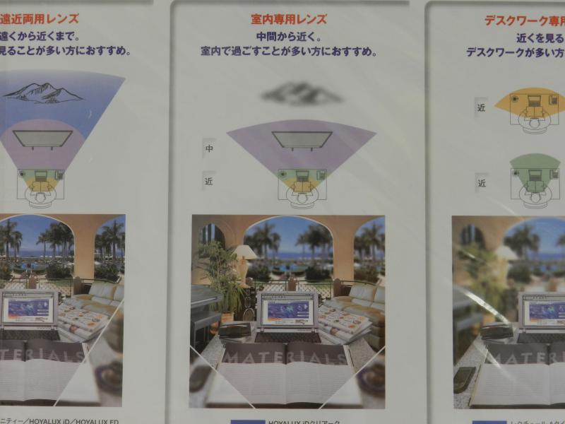 次に、老眼鏡には、単焦点の老眼鏡。近々老眼鏡(手元とパソコン画面が見えるレンズ)そして、中近老眼鏡(手元と、テレビ、壁掛け時計が見えるレンズ)顔を上げた時にスムーズに見えて眼に負担がかりません。
