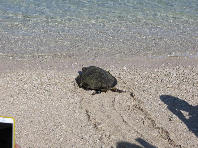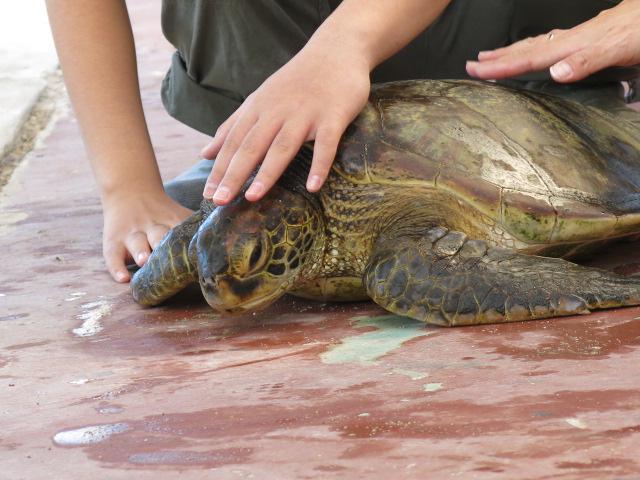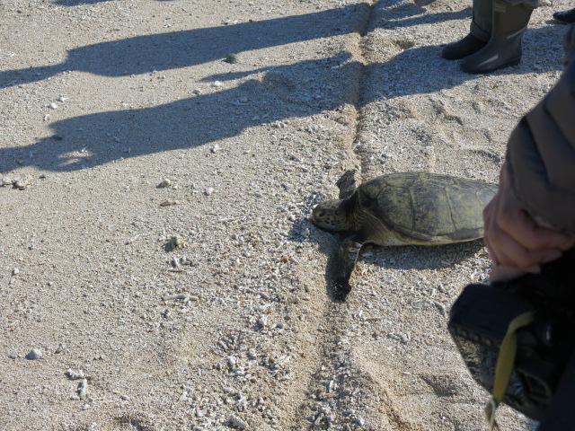 水槽からカメを捕まえて海に放す それだけだが、結構時間がかかってやっと 水槽のカメをスタッフが捕まえた様子。