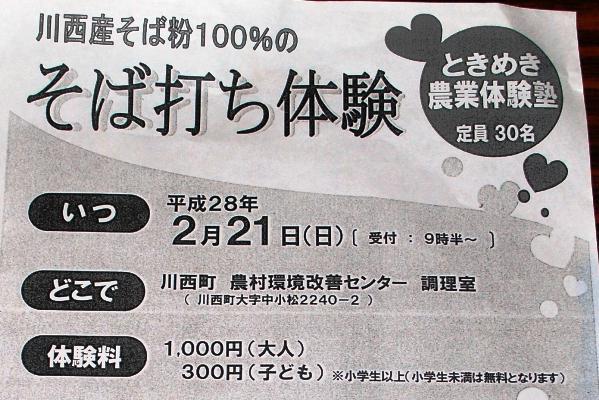 川西町産そば粉100%そば打ち体験2016年2月21日(日)があり参加した。 半自給暮らし準備のじじ、そば打ちは必須事項、そばも植えてもちろんそばを打って食う。都会では家が汚くなるからと禁止されていた。大人1000円、子供300円幼児無料川西町農村環境改善センター 神戸国際大の若者とじじ2人の3人で1テーブル交代で作業、神戸大の彼は見るからにおぼつかない手サポート役のおかあさん、見るからに心配そう。こっちも心配。笑いありの2時間かいもちにそば大盛りおしんこたっぷり。そば湯もおいしくおなかいっぱいになり大満足。打つのはかなり修行がいるが、切りはスムーズ(毎日母の介護で朝食担当、包丁裁きはうまくなった)だった。