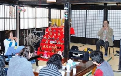 玉庭雛めぐり,岡家のひなは音楽でのおもてなし、地域おこし協力隊をリーダとした若者中心のグループで企画、囲炉裏のある萱吹き古民家で囲炉裏にあたりながら、昔なつかしの歌にロックや童謡が流れる、懐かしい里の暮らしに思いをはせ、こんな暮らしが懐かしいとジーンときたというかたもたくさんいた、古民家の主人となつかしの里山の暮らし語りながらお客さんとのふれあい、初めての雛めぐりはスタッフでの参加でしたがほんとに良い企画でした、また来年も必ず参加したいな。。♪ごぅーにんばゃぁしィーの笛、太鼓って♪♪ 古い古民家で新しい5人囃子に逢いに来年も必ず参加します。ぜひ呼んでください。というか岡家の維持を考えないとどうなるか心配です。