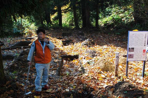 11月5日の峠探訪宇津峠コース、ガイドの説明付きであったので参加、十三峠絵図、宇津峠頂上には「介(たすけ)」と記され、その近くに建物が描かれている、二人扶持・苗字帯刀御免で小屋守を勤めていたとされ、米沢藩の公職であった、最後は米坂線開通後の昭和8年役目を失い、麓に移住し平地になった、今年発掘調査が行われ、基礎跡や茶碗片など出てきたようで、年内には埋め戻すとのことでした、ここから少し登ると、峠頂上となり石碑群が見られます、昔神社もありその跡となる石段などが見られます。