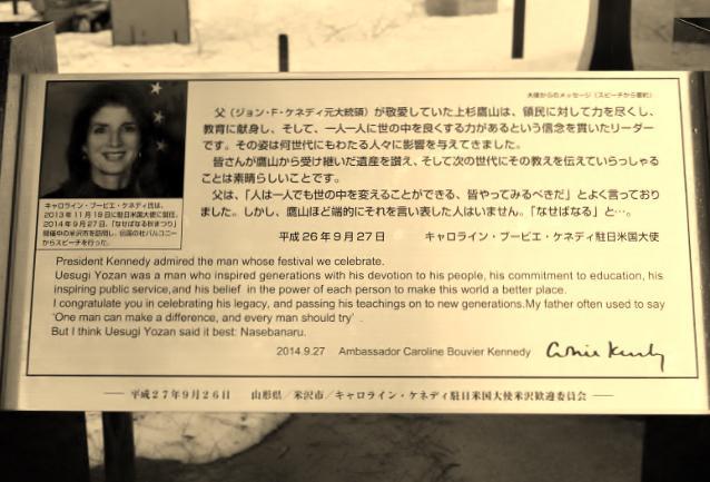 上杉神社を通る通勤朝散歩を初めてからひと月ほどたつ、鷹山公の像の横にジョン・F・ケネディの長女キャロラインさんスピーチの版が建っている、ケネディは『日本で最も尊敬する政治家はだれですか』との質問に「上杉鷹山です」と・・そして2013年11月、駐日米国大使に就任した長女キャロライン・ケネディ、「父ジョン・F・ケネディ元大統領が、江戸時代の米沢藩の名君とされる上杉鷹山を尊敬し、就任演説に代表される考え方に影響を与えた」と述べている。2014年9月27日『なせばなる秋祭り』に米沢市を訪問しスピーチしている要約が刻まれています。私の母は米沢市万世で育ち、万世小学校を出ていて、小さい時から鷹山の『なせばなる・・』を教わったといい、私が幼少時にその話を聞かされた、キャロラインはお父さんからこの『なせばなる』を聞かされたのね・・これ見て、私は孫にこの話を伝えようとふと思った・・しかし像の手前にある石、、”石臼”のようですがポールに鎖でつながっている・・なんであるんだろうか?気になる???