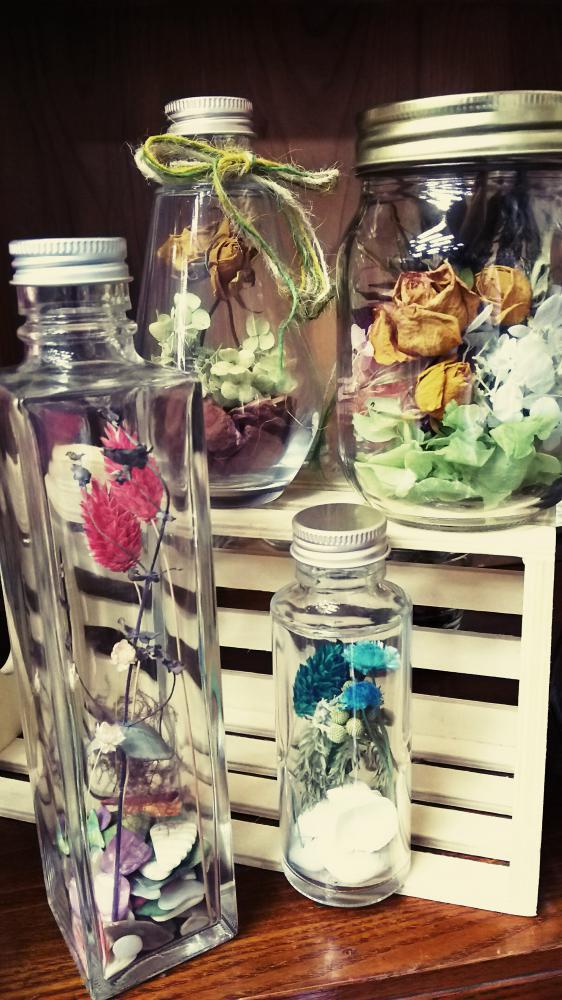 ドライフラワー。大きさ違いのビンに。それぞれ可愛さが違ってステキです。どのビンが好きですか。。。