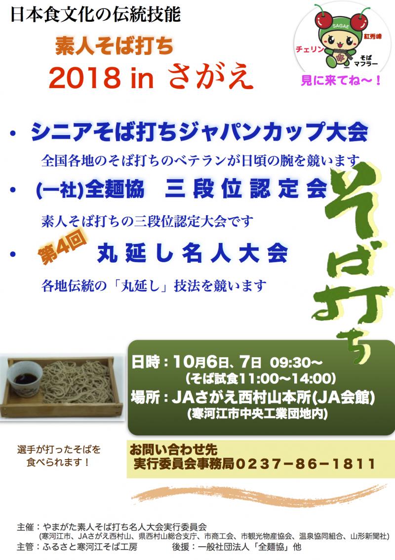 2018年素人そば打ち三段位認定大会を、下記のとおり開催します。どうぞ皆さんお誘い合わせのうえご来場下さい。 ※会場では打ちたての美味しいお蕎麦が食べられます。(11:00〜14:00) お気軽にお越し下さい。○全麺協三段位認定大会 《素人そば打ちの有段者が目指してきました。更に上の段位に挑戦し技を披露します。》 10月7日(日) 9:30〜 開催場所:寒河江市 JAさがえ西村山本所 特設会場 991-0061 寒河江市中央工業団地75 問合せ先(お電話でお願いします) 大会事務局(佐々木、中野) 991-0523 寒河江市大字八鍬字川原919−6 さくらんぼ会館内 п@0237-86-1811 ※なお、初段位・二段位の寒河江認定大会は12月1日(土)に、また第22回「やまがた素人そば打ち名人大会」は翌日の12月2日(日)に開催を予定しています。 ※音楽に合わせて楽しくそばを打つパフォーマンスをYouTubeで公開しています。YouTubeの検索欄に「ふるさと寒河江」、「そば打ち」と入力し検索してご覧下さい。