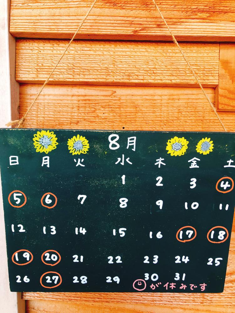 8月のお休みのお知らせです◎お盆の13日(月)は営業いたします!その他、4・5・17・18・19日は臨時休業をいただきます。ご迷惑をおかけいたしますが、よろしくお願いいたします。