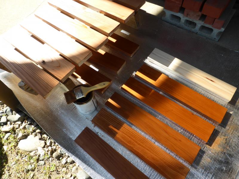 洋間のときの造り付け収納だった一角に、ちょっと休憩できるスペースを!と思いつき、デッキ材を塗装中です(^^)