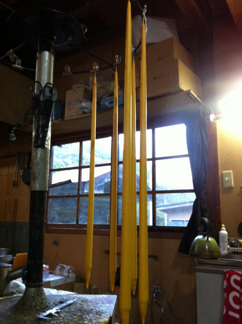 アルミホイルの芯に流し込んだ粗末なものでしたが、夕暮れのハチミツ工場で美しく優しい光を放ちました。