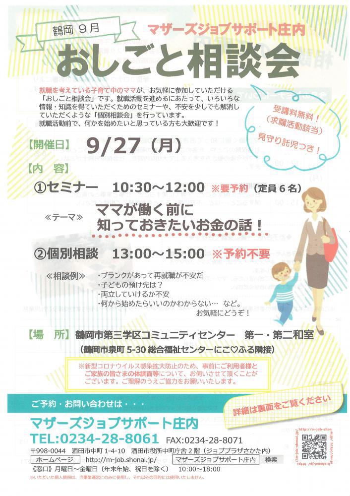 マザーズサポート庄内おしごと相談会 in 鶴岡を開催します。【開催日】9月27日(月)【開催場所】鶴岡市第三学区コミュニティセンター 第一・第二和室(鶴岡市泉町5-30 総合福祉センターにこふる隣接) 【内容】10:30〜12:00 セミナー テーマ「ママが働く前に知っておきたいお金の話」社会保険のことや、年金のこと、「扶養の範囲内で働く」ということなどママが今後の働き方を考える上で大切な内容を、社会保険労務士がお話します。※お申込みが必要です。13:00〜15:00 個別相談会・おしごとに関するお悩み・子育てに関すること・仕事と家事、子育てとの両立 など、お気軽にご相談ください。※どなたでもご利用いただけます、お申込みは不要です。 ♪お子さんと一緒に、お気軽にお越しください♪お子さんと同じお部屋でセミナーを受講し、相談することができます。保育スタッフが、お子さんを見守ります。 ★★受講者の皆様へお願い★★新型コロナウイルス拡大防止のため、・入室時の検温・手指の消毒・会場でのマスク着用・距離をとっての対応・定期的な換気にご協力お願いいたします。新型コロナウイルス感染症の影響により中止または延期となる場合がございます。あらかじめ、ご了承ください。★★ーーーーーーーーーーーーーー★★ ◇お申込み・お問合せ◇マザーズジョブサポート庄内TEL:0234-28-8061