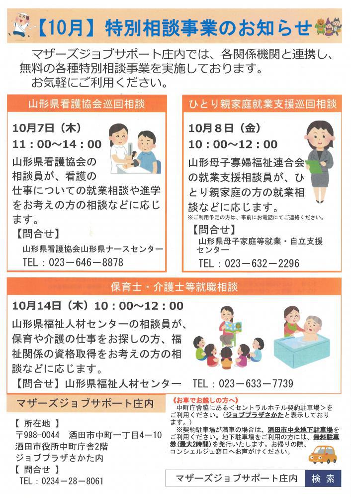 マザーズジョブサポート庄内では、各関係機関と連携し、各種特別相談事業を実施しております。ぜひ、ご利用ください。 山形県看護協会巡回相談 ※お申し込み不要日 時 10月7日(木)11:00〜14:00場 所 マザーズジョブサポート庄内 セミナールーム問合せ 山形県看護協会 пF023-646-8878HP:http://www.nurse-yamagata.or.jp/ 看護の仕事への復職をお考えの方、お気軽にご相談ください。 保育士・介護士等就職相談 ※お申し込み不要日 時 10月14日(木)10:00〜12:00場 所 マザーズジョブサポート庄内 セミナールーム問合せ 山形県福祉人材センター пF023-633-7739HP:http://www.ymgt-shakyo.or.jp/jinzai/保育士・介護士・看護師など資格をお持ちの方や、資格取得を目指している方、福祉職にご関心のある方は、お気軽にお越しください。 ひとり親家庭就業支援相談 [要予約]日 時 10月8日(金)10:00〜12:00場 所 お電話・Zoomを使用しオンラインでの相談問合せ 山形県母子家庭等就業・自立支援センター пF023-632-2296HP:http://www.y-boshi.com/self-support/ひとり親家庭の方や今後について考えている方、どうぞお気軽にご相談ください。※新型コロナウイルス感染拡大防止のため、 しばらくの間お電話やZoomを利用し オンラインでのご相談となります。 ※各相談会について、利用ご希望の方は、マザーズジョブサポート庄内までお気軽にお声掛けください。※ご相談の際、お子さまの託児は『保育ルーム きらきら』をご利用いただけます。託児ルームのご利用には、事前のご登録が必要です。 【駐車場について】お車でお越しの際は、中町庁舎脇にある〈セントラルホテル契約駐車場〉をご利用ください。(ジョブプラザさかたと表示してあります。)※契約駐車場が満車の場合は、酒田市中央地下駐車場をご利用ください。無料駐車券(最大2時間)を発行いたします。お帰りの際に、コンシェルジュ窓口へお声がけください。 ◇お申込み・お問い合わせ◇マザーズジョブサポート庄内TEL:0234-28-8061
