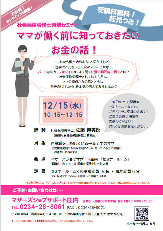☆ママが働く前に知っておきたいお金の話!☆ 「自分にはどんな働き方があっているのかな?」「よく聞く"扶養の範囲内で"働くって…?」プロとしてはもちろんママの視点からも語る社会保険労務士の話とともに自分の『これから』について考えてみませんか? 【日 時】12月15日(水) 10時15分〜12時15分 【対 象】就職を目指している子育て中のママ※就職活動前でも何かを始めたいと思っているママもOK 【会 場】 マザーズジョブサポート庄内 セミナールーム酒田市中町1-4-10酒田市役所中町庁舎2階または ご自宅でオンライン受講(Zoom)【受講料・託児料】 無料【定 員】 @セミナールームでの受講のみ(定員5名)Aオンラインでの受講は随時受け付けております※@の場合は託児もご利用いただけます。【託児定員】 定員5名 ※事前にご登録と利用予約が必要です。 託児開室日水・木・金の16時まで 登録にお越しください。 ★セミナールームご利用の皆様へお願い★新型コロナウイルス拡大防止のため、・入室時の検温・手指の消毒・会場でのマスク着用・距離をとっての対応・定期的な換気にご協力お願いいたします。新型コロナウイルス感染症の影響により中止または延期となる場合がございます。あらかじめ、ご了承ください。●ご自宅でオンライン受講ご利用の方へ●・インターネット環境が必要になります。 通信料は自己負担です。・パソコン、スマートフォン、 またはたタブレットをご準備いただき、 事前にZoom meetingを ダウンロードしてください。・セミナー中はカメラをオンにし、 お顔の見える状態で受講して下さい。 【駐車場について】お車でお越しの際は、中町庁舎脇にある〈セントラルホテル契約駐車場〉をご利用ください。(ジョブプラザさかたと表示してあります。)※契約駐車場が満車の場合は、酒田市中央地下駐車場をご利用ください。無料駐車券(最大2時間)を発行いたします。お帰りの際に、コンシェルジュ窓口へお声がけください。 ◇お申込み・お問い合わせ◇マザーズジョブサポート庄内TEL:0234-28-8061メールでのお申込みはコチラ