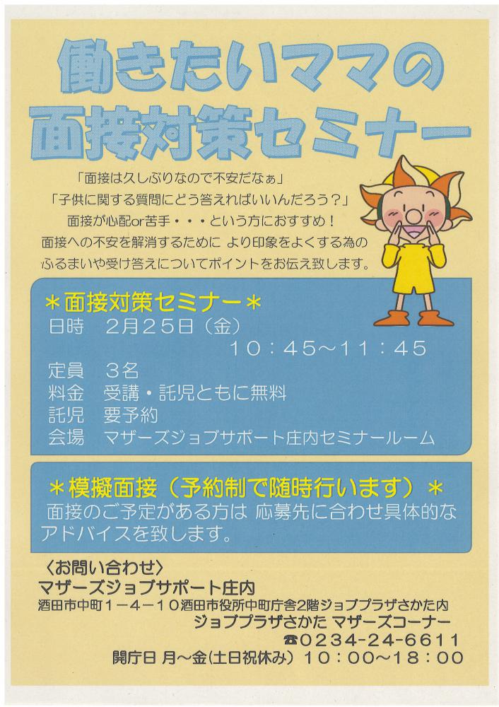 2月 マザーズジョブサポート庄内 求職支援セミナー『働きたいママの 面接対策セミナー』 を行います! このセミナーは 「面接は久しぶりなので不安だなぁ」 「子どもに関する質問に どう答えればいいんだろう?」 面接が心配or苦手… という方におすすめ! 面接への不安を解消するために より印象をよくする為のふるまいや 受け答えについてポイントをお伝え します。 ハローワークマザーズコーナーでは 定期的にセミナーを開催します。 奮ってご参加下さい。 受講後も疑問点など、 窓口にてご相談が受けられます。☆雇用保険受給者の方は 求職活動実績にカウント出来ます☆ 【日 時】 2月25日(金) 10時45分〜11時45分【対 象】 お仕事探し中の子育てママさん【会 場】 マザーズジョブサポート庄内 セミナールーム【料 金】 受講料 及び 託児料 無料【定 員】先着3名 ※お申込みが必要です。【託 児】定員3名 ※事前登録・予約が必要です。 ※併設の保育ルームで、保育スタッフが お子さんをお預かりします。 ママは安心して受講いただけます。 【駐車場について】 お車でお越しの際は、中町庁舎脇にあるセントラルホテル契約駐車場をご利用ください。(ジョブプラザさかたと表示してあります。) ※契約駐車場が満車の場合は、 酒田市中央地下駐車場をご利用ください。 ご利用の方は、無料駐車券を(最大2時間) を発行いたします。 お帰りの際に、マザーズ窓口へお声がけください。※模擬面接 (予約制で随時行います) 面接のご予定がある方は応募先に合わせ具体的な アドバイスを致します。 どうぞ、お気軽にお問い合わせくださいね。 ◇お申込み・お問い合わせ◇ マザーズジョブサポート庄内 TEL:0234-24-6611(ハローワークマザーズコーナー) TEL:0234-28-8061(コンシェルジュコーナー)