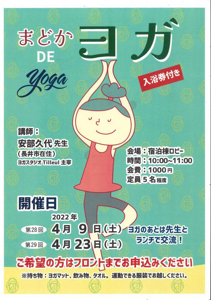 まどかDEヨガ 大好評ヨガの4月の開催日時です♪4月9日(土)10:00〜4月23日(土)10:00〜会費:1,000円(入浴券付) 場所:宿泊棟ロビー※持ち物・ヨガマット・飲み物・タオル・運動で来る服装※ヨガの後は先生と希望者ランチで交流!!