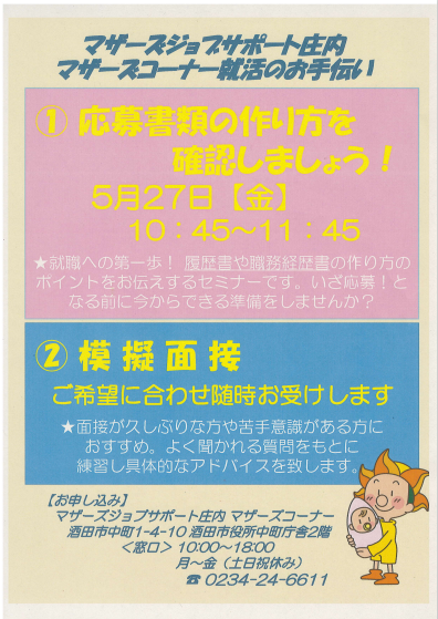5月 マザーズジョブサポート庄内 ☆☆☆模擬面接はご希望に合わせて 随時お受けしております☆☆☆ 求職支援セミナー『応募書類の作り方 確認しましょう!』 を行います! このセミナーは就職への第一歩! 履歴書・職務経歴書のポイント をお伝えします。 ハローワークマザーズコーナーでは 定期的にセミナーを開催します。 奮ってご参加下さい。 受講後も疑問点など、 窓口にてご相談が受けられます。☆雇用保険受給者の方は 求職活動実績にカウント出来ます☆ 【日 時】 5月27日(金) 10時45分〜11時45分【対 象】 お仕事探し中の子育てママさん【会 場】 マザーズジョブサポート庄内 セミナールーム【料 金】 受講料 及び 託児料 無料【定 員】先着3名 ※お申込みが必要です。【託 児】定員3名 ※事前登録・予約が必要です。 ※併設の保育ルームで、保育スタッフが お子さんをお預かりします。 ママは安心して受講いただけます。 【駐車場について】 お車でお越しの際は、中町庁舎脇にある〈セントラルホテル契約駐車場〉をご利用ください。(ジョブプラザさかたと表示してあります。) ※契約駐車場が満車の場合は、 酒田市中央地下駐車場をご利用ください。 ご利用の方は、無料駐車券を(最大2時間) を発行いたします。 お帰りの際に、マザーズ窓口へお声がけください。 どうぞ、お気軽にお問い合わせくださいね。 ◇お申込み・お問い合わせ◇ マザーズジョブサポート庄内 TEL:0234-24-6611(ハローワークマザーズコーナー) TEL:0234-28-8061(コンシェルジュコーナー)