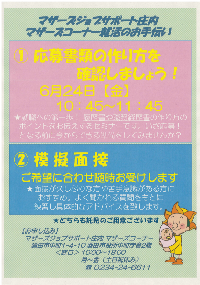 6月 マザーズジョブサポート庄内 ☆☆☆模擬面接はご希望に合わせて    随時お受けしております☆☆☆  求職支援セミナー『応募書類の作り方 確認しましょう!』 を行います!  このセミナーは就職への第一歩! 履歴書・職務経歴書のポイント をお伝えします。  ハローワークマザーズコーナーでは 定期的にセミナーを開催します。 奮ってご参加下さい。 受講後も疑問点など、 窓口にてご相談が受けられます。☆雇用保険受給者の方は 求職活動実績にカウント出来ます☆ 【日 時】 6月24日(金) 10時45分〜11時45分【対 象】 お仕事探し中の子育てママさん【会 場】 マザーズジョブサポート庄内  セミナールーム【料 金】 受講料 及び 託児料 無料【定 員】先着3名 ※お申込みが必要です。【託 児】定員3名 ※事前登録・予約が必要です。 ※併設の保育ルームで、保育スタッフが お子さんをお預かりします。 ママは安心して受講いただけます。                【駐車場について】 お車でお越しの際は、中町庁舎脇にある   セントラルホテル契約駐車場をご利用ください。(ジョブプラザさかたと表示してあります。) ※契約駐車場が満車の場合は、 酒田市中央地下駐車場をご利用ください。 ご利用の方は、無料駐車券を(最大2時間) を発行いたします。 お帰りの際に、マザーズコーナー窓口へお声がけください。  どうぞ、お気軽にお問い合わせくださいね。  ◇お申込み・お問い合わせ◇ マザーズジョブサポート庄内 TEL:0234-24-6611(ハローワークマザーズコーナー) TEL:0234-28-8061(コンシェルジュコーナー)