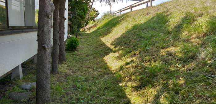 1枚目、今年の土手。 大部分は、県道を管理するところで刈り取りました。私はガードレールの所と、家の軒先辺りを刈り取り。刈った草は撤去しました。撤去しないと、2枚目のように、枯れて腐ってしまい、ガードレールの所もまだ刈り取っていません。異臭がします。うちの敷地の堺まで土手の刈り取りをしています。