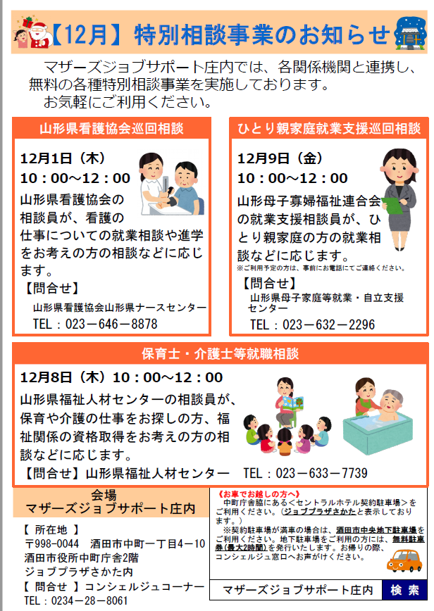 マザーズジョブサポート庄内では、各関係機関と連携し、各種特別相談事業を実施しております。ぜひ、ご利用ください。 山形県看護協会巡回相談 【要予約】日 時 12月1日(木)10:00〜12:00場 所 マザーズジョブサポート庄内 セミナールーム問合せ 山形県看護協会 пF023-646-8878HP:http://www.nurse-yamagata.or.jp/ 看護の仕事への復職をお考えの方、お気軽にご相談ください。 保育士・介護士等就職相談 ※お申し込み不要日 時 12月8日(木)10:00〜12:00場 所 マザーズジョブサポート庄内 セミナールーム問合せ 山形県福祉人材センター пF023-633-7739HP:http://www.ymgt-shakyo.or.jp/jinzai/保育士・介護士・看護師など資格をお持ちの方や、資格取得を目指している方、福祉職にご関心のある方は、お気軽にお越しください。 ひとり親家庭就業支援相談 [要予約]日 時 12月9日(金)10:00〜12:00場 所 マザーズジョブサポート庄内 セミナールーム *コロナの状況により、オンライン開催となります。問合せ 山形県母子家庭等就業・自立支援センター пF023-632-2296HP:http://www.y-boshi.com/self-support/ひとり親家庭の方や今後について考えている方、どうぞお気軽にご相談ください。 ※各相談会について、利用ご希望の方は、マザーズジョブサポート庄内までお気軽にお声掛けください。※ご相談の際、お子さまの託児は『保育ルーム きらきら』をご利用いただけます。託児ルームのご利用には、事前のご登録が必要です。 【駐車場について】お車でお越しの際は、中町庁舎脇にあるセントラルホテル契約駐車場をご利用ください。(ジョブプラザさかたと表示してあります。)※契約駐車場が満車の場合は、酒田市中央地下駐車場をご利用ください。無料駐車券(最大2時間)を発行いたします。お帰りの際に、コンシェルジュ窓口へお声がけください。 ◇お申込み・お問い合わせ◇マザーズジョブサポート庄内TEL:0234-28-8061メールでのお申込みはコチラ
