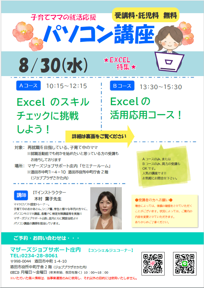 ☆マザーズジョブサポート庄内主催☆再就職応援『パソコン講座』のお知らせ ≪Aコース≫  8月30日(水)10:15〜12:15『Excelのスキルチェックに挑戦しよう!』Excelの基本操作、実務で役立つ内容を問題にして指示された操作ができるかチェックします。解説を聞きながら操作をして理解を深めましょう!   ≪Bコース≫  8月30日(水)13:30〜15:30『Excelの活用応用コース!』「見やすい表を手早く作る」コツを学びます。実務を意識して、請求書の作り方や書類の管理のし仕方で役立つ情報も学べます。知っているだけで毎日の業務が変わる仕事ワザをマスターしましょう。 ♪片方のコースのみ、両方のコース、どちらの受講でも可能です♪【対 象】就職を目指している子育て中のママ※就職活動前で何かを始めたいママもOK【会 場】マザーズジョブサポート庄内 セミナールーム【料 金】受講料 及び 託児料 無料【託 児】 ※事前登録・予約が必要です。保育ルーム開室日【水・木・金】の 10:00〜16:00に登録にお越し下さい。 ※併設の保育ルームで、保育スタッフが お子さんをお預かりします。 ママは安心して受講いただけます。 【駐車場について】お車でお越しの際は、中町庁舎脇にあるセントラルホテル契約駐車場をご利用ください。(ジョブプラザさかたと表示してあります。)※契約駐車場が満車の場合は、酒田市中央地下駐車場をご利用ください。無料駐車券(最大2時間)を発行いたします。お帰りの際に、コンシェルジュ窓口へお声がけください。 ★★受講者の皆様へお願い★★場合によっては、体調の確認をさせていただくことがございます。状況によっては、ご案内の変更をさせていただきます。あらかじめご了承ください。★★ーーーーーーーーーーーー★★どうぞ、お気軽にお問い合わせくださいね。 ◇お申込み・お問い合わせ◇マザーズジョブサポート庄内TEL:0234-28-8061メールでのお申込みはコチラ