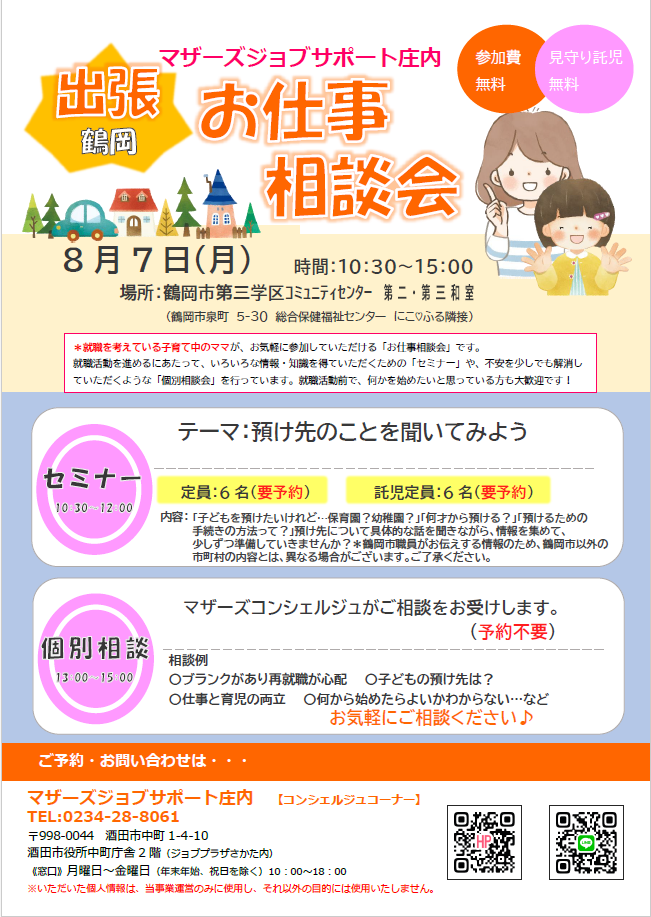 マザーズジョブサポート庄内おしごと相談会 in 鶴岡を開催します。 【開催日】8月7日(月)【開催場所】鶴岡市第三学区コミュニティセンター 第二・第三和室【内容】◎10:30〜12:00 セミナー 「預け先のことを聞いてみよう」 ※お申し込みが必要です 「子どもを預けたいけれど保育園?幼稚園?」 「何歳から預ける?」 「預けるための手続きの方法って?」 鶴岡市職員を講師に招きし、預け先について 具体的な話をお聞きします。 情報収集をしながら少しずつ準備して いきましょう。 ◎13:00〜15:00 個別相談会 ※どなたでもご利用いただけます、 お申込みは不要です。 ・おしごとに関するお悩み ・子育てに関すること ・仕事と家事、子育てとの両立 など、お気軽にご相談ください。 ♪お子さんと一緒に、お気軽にお越しください♪お子さんと同じお部屋でセミナーを受講し、相談することができます。保育スタッフが、ママをサポートいたします。★★利用者の方へお願い★★場合によっては、体調の確認をさせていただくことがございます。状況によっては、ご案内の変更をさせていただきます。あらかじめご了承ください。★★ーーーーーーーーーーーー★★どうぞ、お気軽にお問い合わせくださいね。 ◇お申込み・お問い合わせ◇マザーズジョブサポート庄内TEL:0234-28-8061メールでのお申込みはコチラ