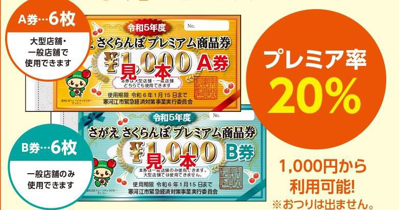 新型コロナウィルス感染拡大や物価高騰の影響により停滞する地域経済の活性化のため、寒河江市内のお店で20%お得にご利用いただける「さがえさくらんぼプレミアム商品券(紙)」を65歳以上の方限定で販売いたします。 さがえさくらんぼプレミアム商品券チラシ ご注意ください!★65歳以上(11月1日現在)の寒河江市民が購入対象者になります。★購入対象者には購入申込ハガキが送付されます。★購入の際には購入申込ハガキが必要です。★おつりは出ません。返品、返金もできませんのでご注意ください。★たばこ、公共料金支払、ごみ袋、商品券等、事業仕入等、ご購入できないものがございます。くわしくは商品券の裏面をご覧ください。★大型店舗でご利用いただけるのはA券だけ(12枚中6枚)です! ☆一般店舗…A券・B券両方ご利用いただけます ☆大型店舗…A券のみご利用いただけます 販売期間:令和5年9月2日(土)〜9月15日(金) 販売数量は十分にご用意してあります。感染対策実施の上、体調にご留意の上おいでください。 販売場所: 9/2(土)、9/3(日)フローラSAGAE2階・寒河江市役所・南部公民館・西部公民館・この木交流センター 9/4(月)〜9/15(金)フローラSAGAE1階・寒河江市商工会 購入方法:65歳以上の方に郵送された購入申し込みハガキをお持ちください購入限度:一人2冊まで(1冊10,000円で12,000円利用可能)使用期限:令和5年9月2日(土)〜令和6年1月15日(月)加盟店 :店頭にポスターが貼られているお店でご利用いただけます。加盟店リストは別記事にございます。
