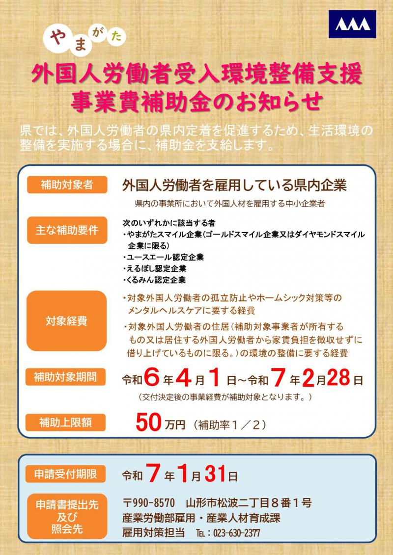 山形県では、外国人労働者の県内定着を促進するため、生活環境の整備を実施する場合に、補助金を支給します。 ■補助対象者外国人労働者を雇用している県内企業 ■主な補助要件次のいずれかに該当する者・やまがたスマイル企業(ゴールドスマイル企業又はダイヤモンドスマイル企業に限る)・ユースエール認定企業・えるぼし認定企業・くるみん認定企業 ■対象経費・対象外国人労働者の孤立防止やホームシック対策等のメンタルヘルスケアに要する経費・対象外国人労働者の住居の環境整備に要する経費 ■補助対象期間令和6年4月1日〜令和7年2月28日※交付決定後の事業経費が補助対象となります。 ■補助上限額50万円(補助率1/2) ■申請受付期限令和7年1月31日 ■申請書提出先・お問合せ先山形県産業労働部 雇用・産業人材育成課雇用対策担当 TEL:023-630-2377 ※詳しくはチラシ・補助金交付要綱をご確認ください。