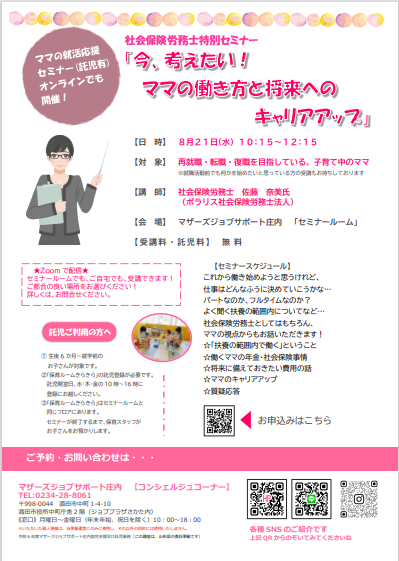 ☆今、考えたい! ママの働き方と将来へのキャリアアップ☆「自分にはどんな働き方があっているのかな?」「よく聞く"扶養の範囲内で"働くって…?」プロとしてはもちろんママの視点からも語る社会保険労務士の話とともに自分の『これから』について考えてみませんか? 【日時】8月21日(水)10:15〜12:15【対象】再就職・転職・復職を目指している子育て中のママ※就職活動前で何かを始めたい方でもOK 【会場】マザーズジョブサポート庄内 セミナールーム (酒田市中町1-4-10 酒田市役所中町庁舎2階) またはご自宅でオンライン受講(Zoom) 【料金】受講料 及び 託児料 無料 【定員】@セミナールームでの受講Aオンラインでの受講(随時受け付けております)※@の場合は託児もご利用いただけます。【託児】 ※事前登録・予約が必要です 保育ルーム開室日【水・木・金】の10:00〜16:00に登録にお越し下さい。 ※併設の保育ルームで、保育スタッフが お子さんをお預かりします。 ママは安心して受講いただけます。 ●ご自宅でオンライン受講ご利用の方へ●・インターネット環境が必要になります。 通信料は自己負担です。・パソコン、スマートフォン、 またはたタブレットをご準備いただき、 事前にZoom meetingを ダウンロードしてください。・セミナー中はカメラをオンにし、 お顔の見える状態で受講して下さい。 【駐車場について】 お車でお越しの際は、中町庁舎脇にある セントラルホテル契約駐車場をご利用ください。(『ジョブプラザさかた』と表示してあります。) ※契約駐車場が満車の場合は、 酒田市中央地下駐車場をご利用ください。 地下駐車場をご利用の方は、 無料駐車券(最大2時間)を発行いたします。 お帰りの際にコンシェルジュ窓口へお声がけください。どうぞ、お気軽にお問い合わせくださいね。◇お申込み・お問い合わせ◇マザーズジョブサポート庄内TEL:0234-28-8061メールでのお申込みはコチラ