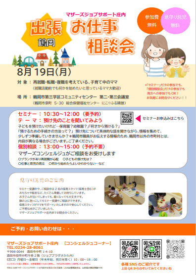 ●8月マザーズおしごと相談会in鶴岡開催のお知らせ