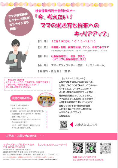 ☆今、考えたい! ママの働き方と将来へのキャリアアップ☆「自分にはどんな働き方があっているのかな?」「よく聞く"扶養の範囲内で"働くって…?」プロとしてはもちろんママの視点からも語る社会保険労務士の話とともに自分の『これから』について考えてみませんか? 【日時】12月19日(木)10:15〜12:15【対象】再就職・転職・復職を目指している子育て中のママ※就職活動前で何かを始めたい方でもOK 【会場】マザーズジョブサポート庄内 セミナールーム (酒田市中町1-4-10 酒田市役所中町庁舎2階) またはご自宅でオンライン受講(Zoom) 【料金】受講料 及び 託児料 無料 【定員】@セミナールームでの受講Aオンラインでの受講(随時受け付けております)※@の場合は託児もご利用いただけます。【託児】 ※事前登録・予約が必要です 保育ルーム開室日【水・木・金】の10:00〜16:00に登録にお越し下さい。 ※併設の保育ルームで、保育スタッフが お子さんをお預かりします。 ママは安心して受講いただけます。 ●ご自宅でオンライン受講ご利用の方へ●・インターネット環境が必要になります。 通信料は自己負担です。・パソコン、スマートフォン、 またはたタブレットをご準備いただき、 事前にZoom meetingを ダウンロードしてください。・セミナー中はカメラをオンにし、 お顔の見える状態で受講して下さい。 【駐車場について】 お車でお越しの際は、中町庁舎脇にある セントラルホテル契約駐車場をご利用ください。(『ジョブプラザさかた』と表示してあります。) ※契約駐車場が満車の場合は、 酒田市中央地下駐車場をご利用ください。 地下駐車場をご利用の方は、 無料駐車券(最大2時間)を発行いたします。 お帰りの際にコンシェルジュ窓口へお声がけください。どうぞ、お気軽にお問い合わせくださいね。◇お申込み・お問い合わせ◇マザーズジョブサポート庄内TEL:0234-28-8061メールでのお申込みはコチラ