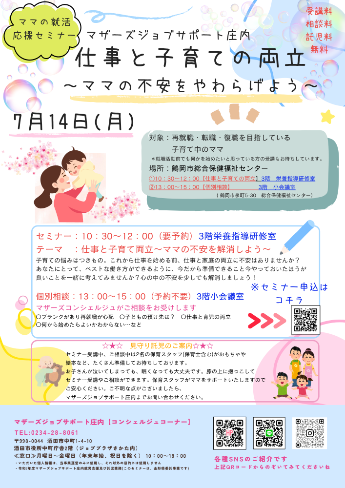 マザーズジョブサポート庄内【仕事と子育ての両立 〜ママの不安をやわらげよう〜】主張相談会を開催します。【開催日】7月14日(月)【開催場所】鶴岡市総合保健福祉センター(鶴岡市泉町5-30  総合保健福祉センター)@10:30〜12:00 セミナー    3階 栄養指導研修室A13:00〜15:00 個別相談    3階 小会議室 【内容】@10:30〜12:00(要予約) セミナーテーマ【仕事と子育ての両立   〜ママの不安をやわらげよう〜】子育ての悩みはつきもの。これから仕事を始める前に、仕事と家庭の両立に不安はありませんか?あなたにとってベストな働き方を一緒に考えてみましょう。A13:00〜15:00(予約不要) 個別相談・ブランクがあり再就職が心配・子どもの預け先は?・仕事と家事、子育てとの両立      など、お気軽にご相談ください。※どなたでもご利用いただけます。 ♪お子さんと一緒に、お気軽にお越しください♪お子さんと同じお部屋でセミナーを受講し、相談することができます。保育スタッフが、ママをサポートいたします。 どうぞ、お気軽にお問い合わせくださいね。☆★☆コンシェルジュコーナーでLINEアカウントやっております♪              ☆★☆セミナーのお知らせや、お問い合わせ、お申込みにも対応しています♪ぜひお友達になってください☆https://lin.ee/zBnhdYULINEの場合は「お名前、電話番号、申込み講座、託児の有無」を送信して返信をお待ちください