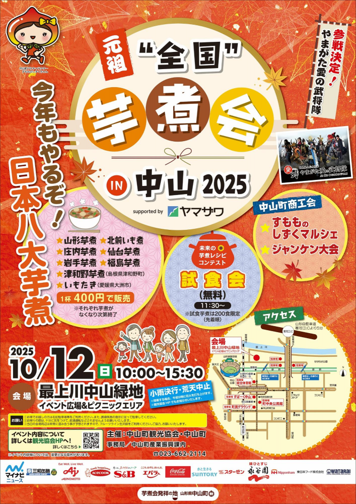 芋煮会発祥の地で味わう、日本各地の味元祖“全国”芋煮会 in 中山2025山形県の秋の風物詩「芋煮会」。その発祥の地・中山町で、日本各地の芋煮が一堂に会する「元祖“全国”芋煮会 in 中山 2025」が開催されます!定番の山形芋煮から、愛媛の「いもたき」まで、個性豊かな日本八大芋煮を味わえる、まさに芋煮の祭典。ご家族や友人と一緒に、芋煮文化の奥深さを満喫しませんか? イベント基本情報 開催日令和7年10月12日(日曜日) 開催時間10:00 〜 15:30(開場 9:30) 会場最上川中山緑地(イベント広場&ピクニックエリア) 開催判断小雨決行・荒天中止。開催時は午前9時に花火でお知らせ。中止の場合は中山町観光協会HPにて告知。 日本八大芋煮を味わおう!会場では、中山町が選定した「日本八大芋煮」を1杯400円で販売!3杯まとめて買うと1,000円とお得になります。先に共通券を購入してから、お好みの芋煮ブースへGO!▼ 八大芋煮ラインナップはこちら ★ 山形芋煮(牛肉・醤油) ★ 北前いも煮(棒だら・醤油) ★ 庄内芋煮(豚肉・味噌) ★ 仙台芋煮(豚肉・味噌) ★ 岩手芋煮(鶏肉・醤油) ★ 福島芋煮(豚肉・味噌/醤油) ★ 津和野芋煮(小鯛出汁・すまし) ★ いもたき(鶏肉・醤油)※前売り券なし、当日販売のみ。各芋煮はなくなり次第終了です。※八大芋煮以外のブースでは共通券は使えません。 芋煮以外の注目イベント 未来の芋煮レシピコンテスト試食会 (11:30〜)新しい芋煮3作品を無料で試食!あなたの投票でグランプリが決まります(先着200名)。 ステージイベント (10:00〜)オープニングを飾る「やまがた愛の武将隊」の演舞は必見! すもものしずくマルシェ&ジャンケン大会中山町商工会によるマルシェ。豪華景品が当たるジャンケン大会(15:00〜)もお楽しみに! アクセス・駐車場情報お車をご利用の場合山形自動車道「寒河江IC」より国道112号経由で約5分。会場周辺に複数の無料駐車場がありますが、混雑が予想されます。河川敷内は一方通行などの規制にご注意ください。JRをご利用の場合JR左沢線「羽前長崎駅」より会場まで徒歩約15分です。 よくある質問 (FAQ)Q. 芋煮の予約はできますか?A. いいえ、八大芋煮の予約・前売り券はありません。当日会場の受付で「共通券」をお買い求めの上、各ブースで交換してください。Q. 自分の鍋やコンロを持ち込めますか?A. 会場内での直火は禁止されていますが、「団体用エリア」を予約すれば、カマドを利用して自分たちで芋煮会を楽しめます。予約にはヤマザワ中山店で「いも煮会セット」の購入が必要です(12組限定)。Q. イベントの問い合わせ先は?A. 中山町観光協会(電話: 023-662-2114)へお問い合わせください。p{margin:0;} a{color:#007bff; text-decoration:none; font-weight:bold;} a:hover{opacity:0.8; text-decoration:underline;} .fade-in{opacity:0; transform:translateY(20px); transition:opacity 0.8s ease-out, transform 0.8s ease-out;} .fade-in.is-visible{opacity:1; transform:translateY(0);} .section-title{font-size:1.4em; color:#333; margin:0 0 20px 0; padding-left:15px; display:flex; align-items:center; font-weight:800; border-left: 5px solid;} .icon-brown{color:#AF642D; margin-right:10px;} .info-grid{display:grid; grid-template-columns:1fr; gap:15px;} .info-item{display:flex; align-items:flex-start; gap:10px;} .info-icon{color:#8D6E63; margin-top:4px;} .info-label{font-weight:bold; color:#333; display:block; margin-bottom:2px;} .accordion{margin-top:15px; border:1px solid #ddd; border-radius:5px;} .accordion-summary{font-weight:bold; cursor:pointer; padding:10px; background-color:#f9f9f9;} .accordion-content{padding:15px;} .imoni-list{list-style:none; padding:0; margin:0; display:grid; grid-template-columns:repeat(auto-fit, minmax(220px, 1fr)); gap:10px; font-size:0.9em;} .event-card{background-color:#f5f8fa; padding:15px; border-radius:8px;} .event-title{font-size:1.1em; margin:0 0 8px 0; display:flex; align-items:center; color:#1E8449; font-weight:bold;} .event-title i{margin-right:8px;} .event-card p{font-size:0.9em;} .faq-item{margin-bottom:15px; border:1px solid #ddd; border-radius:8px; overflow:hidden;} .faq-q{background-color:#f7f7f7; padding:15px; font-weight:bold; color:#6D4C41;} .faq-a{padding:15px;}document.addEventListener("DOMContentLoaded", () => { const sections = document.querySelectorAll(".fade-in"); const observer = new IntersectionObserver( entries => { entries.forEach(entry => { if (entry.isIntersecting) { entry.target.classList.add("is-visible"); observer.unobserve(entry.target); } }); }, { threshold: 0.1 } ); sections.forEach(section => { observer.observe(section); }); });{"@context":"https://schema.org","@graph":[{"@type":"Article","mainEntityOfPage":{"@type":"WebPage","@id":"https://yamagata-kouiki.info/log/?l=imonikai2025"},"headline":"【2025】元祖“全国”芋煮会 in 中山|日本八大芋煮が集結する発祥の地の祭典","author":{"@type":"Organization","name":"やまがた広域観光協議会"},"publisher":{"@type":"Organization","name":"やまがた広域観光協議会","logo":{"@type":"ImageObject","url":"https://yamagata-kouiki.info/images/logo.png"}},"image":{"@type":"ImageObject","url":"https://www.town.nakayama.yamagata.jp/material/images/group/11/imonikai_flyer_omote.jpg"},"datePublished":"2025-09-22T00:00:00+09:00","dateModified":"2025-09-22T00:00:00+09:00","description":"2025年10月12日、芋煮会発祥の地・中山町で「元祖“全国”芋煮会」開催!山形芋煮はもちろん、仙台、庄内、愛媛のいもたき等