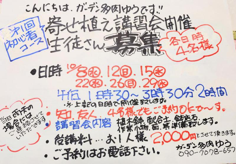 以前もお伝えしましたが、ひとりで…できるもん?(寄せ植え教室):中川公民館日記川樋の【ガーデン多肉ゆう】さんが、寄せ植え教室を開催するとのこと。参加者募集中です!!また、10月はハロウィン寄せ植えも予約限定販売とのこと!3連寄せ植え、グラス寄せ植え、ハロウィン缶寄せ植えと各種数に限りがありますので、お早めにご予約下さい(*‘ω‘ *)寄せ植え教室、ハロウィン限定予約ともに、直接【ガーデン多肉ゆう】さんにお申し込みください(^^)/