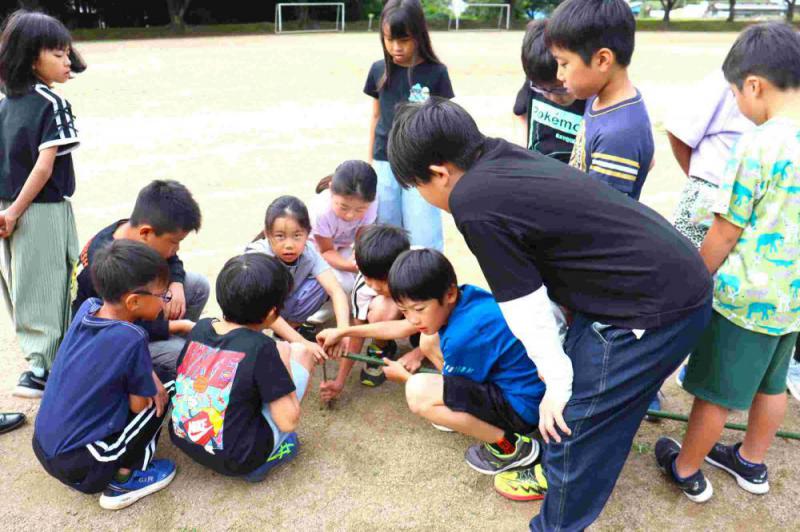 3年生が、算数の学習でグラウンドに出ていました。円の学習の1時間めです。18人が入れる円を竹棒を使って描きました。その後、もっと大きな円はできないかと試行錯誤です。悩んだ末、中心がぶれないことが必要なことに気づき、さらに、テープをピンと張って円を描くことにも気づきました。「円」「中心」「半径」など、今後の学習で使う用語も自然に先生から示されていました。実体験をもとにした授業ですでの、用語だけでなく、コンパスの使用にも役立っていくのではないでしょうか。