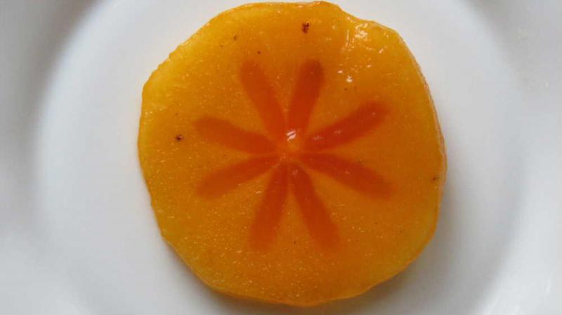 ●これは何の花? 今年最後のカキを近所の方からいただいたので皮を向いて輪切りにしてみました 白い皿にもった模様にいつも食べているカキとは思えない花柄模様を浮き上がらせています  熊騒ぎで話題となった果物の一つで熊の餌となっているカキの木が数多く切り倒されたとのニュースも流れた一年でした