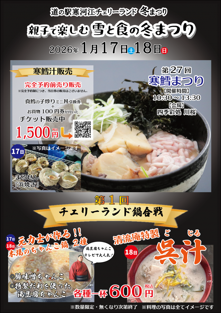 道の駅寒河江チェリーランド雪と食の 冬まつり2026 1月17日(土)・18日(日) 寒河江の冬はワクワクがいっぱい! 真っ白な雪で遊んで、あったかい鍋を食べて、甘〜いイチゴに、にっこり笑顔♪一日中遊べるイベントが盛りだくさん! 第27回 寒鱈まつり 1/8(木) からチケット販売開始! 完全予約前売り販売制当日のチケット販売はありません。 料金: 1,500円(税込) 会場: 四季彩処 川桜 時間: 10:30 〜 13:30セット内容・寒鱈汁 ・真鱈の子炒りミニ丼引換券 ・お買物100円券公式サイトでチケットを確認 あったか〜い!鍋合戦17日(土)・18日(日)元力士の本格ちゃんこ鍋「豚味噌ちゃんこ」と特製だれを使った「湯豆腐ちゃんこ」が登場!力士直伝の味でパワーチャージ!各 一杯 600円(税込)18日(日) 限定!清流庵特製 呉汁(ごじる)大豆の風味がたまらない郷土の味。濃厚な一杯をどうぞ。一杯 600円(税込) 雪あそび ・ ライブ 雪あそびコーナーチューブ・そり の無料貸出あり!雪だるまを作ったり、雪遊びを思いっきり遊ぼう! しおたん&syugo LIVE17日(土) 14:00テレビ番組「歌唱王2024」優勝のしおたん が凱旋!心震える歌声をお届け。 キャラクター集合17日(土)のみチェリンをはじめ、かわいいご当地キャラたちが会場に遊びに来るよ♪ いちご&限定グルメ 矢板市産「とちあいか」大特売会17日(土) 9:00〜限定200パック!早いもの勝ち 連携協定を結ぶ「道の駅やいた」から直送!甘〜いイチゴをお土産にいかが? 冬のホットドリンク 地元フルーツのホットワイン、甘酒、ホットジュースで温まろう。 メガ盛りメニュー! 全てのせトッピング×麺2玉分のスペシャルそば・うどん一杯1,300円(先着20名 )や さくらんぼ ジャンボパフェ5,000円(限定10食)が登場! アクセス 日時: 2026年1月17日(土)・18日(日) 問合せ: 0237-86-3111 (チェリーランドさがえ) 道の駅 寒河江 チェリーランド { "@context": "https://schema.org", "@graph": [ { "@type": "Event", "name": "道の駅寒河江チェリーランド 冬まつり2026", "startDate": "2026-01-17", "endDate": "2026-01-18", "eventStatus": "https://schema.org/EventScheduled", "eventAttendanceMode": "https://schema.org/OfflineEventAttendanceMode", "location": { "@type": "Place", "name": "道の駅寒河江チェリーランド", "address": { "@type": "PostalAddress", "streetAddress": "大字八鍬字川原919-8", "addressLocality": "寒河江市", "addressRegion": "山形県", "postalCode": "990-0523", "addressCountry": "JP" } }, "image": [ "https://yamagata-kouiki.info/assets/images/event/cherryland_winter2026.jpg" ], "description": "親子で楽しむ雪と食の冬まつり。寒鱈まつり、鍋合戦、雪遊び、いちご特売、しおたんスペシャルライブなど開催。", "performer": { "@type": "Person", "name": "しおたん" }, "organizer": { "@type": "Organization", "name": "チェリーランドさがえ", "url": "https://www.cherryland.co.jp/" } }, { "@type": "FAQPage", "mainEntity": [ { "@type": "Question", "name": "寒鱈まつりのチケットは当日買えますか?", "acceptedAnswer": { "@type": "Answer", "text": "いいえ、寒鱈汁販売は「完全予約前売り販売」となっており、当日の販売はありません。2026年1月8日(木)より販売開始される前売りチケットをお買い求めください。" } }, { "@type": "Question", "name": "雪遊びコーナーは有料ですか?", "acceptedAnswer": { "@type": "Answer", "text": "いいえ、チューブやそりの貸出は無料です。雪だるまづくり体験なども楽しめます。" } } ] } ]}