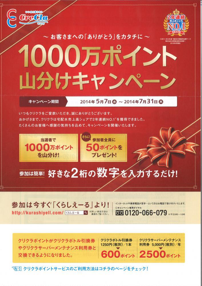 〜 お客様への「ありがとう」をカタチに 〜 いつもご愛飲いただき、誠にありがとうございます。  クリクラ(宅配水) は、5月連休明けより『 クリクラ1000万ポイント山分け キャンペーン!』  を実施中!!  好きな2桁の数字を画面で入力するだけでエントリー完了!ラッキーナンバーと一致したお客様に1000万ポイント山分け!!   ちなみに・・・ 5月分当選発表 当選番号:22 当選者数:255名 1人あたりの山分けポイント数:11,765ポイント   (ノ゚ο゚)ノ オオォォォ- 1万円分以上のポイントが山分けになったのかぁ!クリクラ愛用中の我が家では、5月、6月分の当選番号を入力し忘れてしまいましたーー(´;ω;`)もったいない!7月の分は、忘れずに!!、 入力してきました ( ^∀^)♪当たるといいな〜(^人^)♪   溜まったポイントは、通販サイト「 くらしえーる 」内の商品と交換ができます♪   ※ クリクラをご愛飲頂いているお客様限定のキャンペーンになります。   クリクラ をまだお試しされていないお客様も、  是非この機会にクリクラを始めてみませんか?    お問い合わせは、こちらから ▼  ”1週間の無料お試し”もできます♪ ク リ ク ラ 月 岡   TEL : 023-672-0823   ※ クリクラをご愛飲頂いているお客様限定のキャンペーンになります。       ( 大事な事なので2度言いました。笑 )