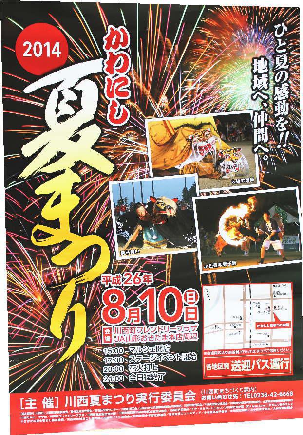 真夏の小松は・・・・出会い、ふれあい、ふるさと再発見!!★第二弾8月10日(日)、川西町フレンドリープラザ周辺において、「ひと夏の感動を!!地域へ、仲間へ・川西夏まつり」が今年も盛大に開催されます。川西夏まつりの名物は色々あれど、超近で見ることができる「花火の打ち上げ」は圧巻です。当日は●午後3時〜売店開始(川西スタイルマルシェ・生ビール・焼き鳥など)●午後5時〜イベント開始(詳しくは川西町町報web版をご覧ください)●午後8時〜大花火打ち上げ●午後9時〜終了予定★3年目を迎える「川西夏まつり」は趣向、場所も新たに 当町最大のイベントとして、今年も多くのスタッフ、ボランティアの ご協力により開催されます。★小松地区交流センターでは、出店で協賛いたします。 「おいしい生ビール」の大看板を目安に是非ご来店ください。第3段・・新山神社祭礼獅子舞(8/15)第4段・・小松地区おまつり広場(8/26)等々・・真夏の企画がいっぱい・・!!