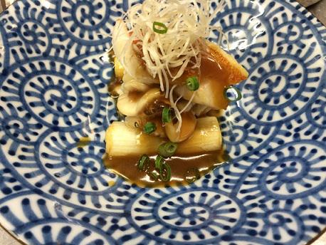 さて、食通の味よしファンの皆様!!この一品の中にどのくらいの食材が使ってあり、それぞれの食感を生かす調理法や味付けや繊細な工夫がしてあるか、気づいて下さいますか??(寒中ねぎ、きんき、鱈の白子、大根の唐揚げ)