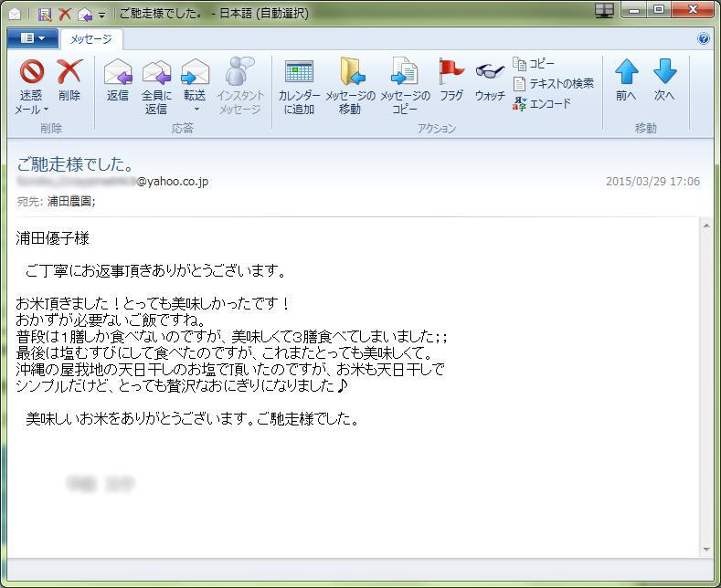 天日干し有機米と有機米をお送りしたお客様から頂いたご感想のメール。ありがとうございます!!!塩むすびって、お米の甘さがほわんと膨らむので、私も大好き!子どもたちからもお弁当のリクエストに、「塩むすび」って言われることも多いです。