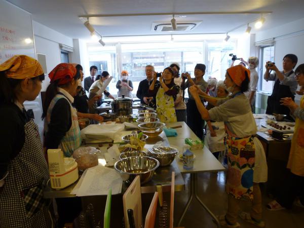 11月1日(日)、東京都の杉並区阿佐ケ谷にある「市庭(いちば)阿佐ケ谷スタジオ)」において、置賜農業高校生の豆料理講習会(ワークショップ)が開催されました。「山形の高校生が東京で料理講習会?」といっても5人ぐらい参加者が集まるのかな。そんな不安を抱えながら、上京。前日、入念な準備をしてリハーサル。そして、当日。30分前から集まり始めた参加者の数は、28名。スタッフや取材に訪れたNHKの方を入れると、35名という予想もしなかった人数に膨れ上がりました。遠くは横浜からの参加者も有り、生徒達は感激。でも、ワークショップ進行中は、青息吐息で、初めての経験に汗だくでした。内容は、紅大豆ご飯の炊き方、手作り紅大豆大福の作り方、青豆打ち豆の作り方、打ち豆入りかぶ汁・煮豆の作り方と進み、最後に全員で試食。「美味しい。」「こんな簡単に作れるのね。」「高校生の笑顔が素敵。」「高校生と一緒にステキな時間が過ごせて感動。」等々、たくさんのご感想や、お褒めの言葉をいただき、疲れ切った高校生には一番の栄養剤をいただいた感があります。高円寺南「スリースペースヒトツナ」や北千住「甘味喫茶ます味」で開店した「置農豆の駅」も含めて、今後ともよろしくお願いいたします。また、12月12日には第2回豆料理ワークショップを、「フリースペースヒトツナ」をお借りして開催しますので、興味のある方はお出でください。詳しいことは近日中に掲載します。