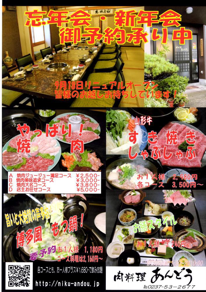肉料理あんどう「忘年会・新年会ご予約賜り中」只今、肉料理あんどうでは、ご予算・お好みに合わせた「忘年会・新年会」のいろんな企画をご用意して、皆様のお越しをお待ちしています。お電話・メール等で、お問い合わせください。素敵な仲間と、美味しい・旨い「山形牛」を食べて、お酒を飲めば至福の時、間違いなし、みんな笑顔になります(*^・^*)皆様のお越しお待ちしていますm(__)m
