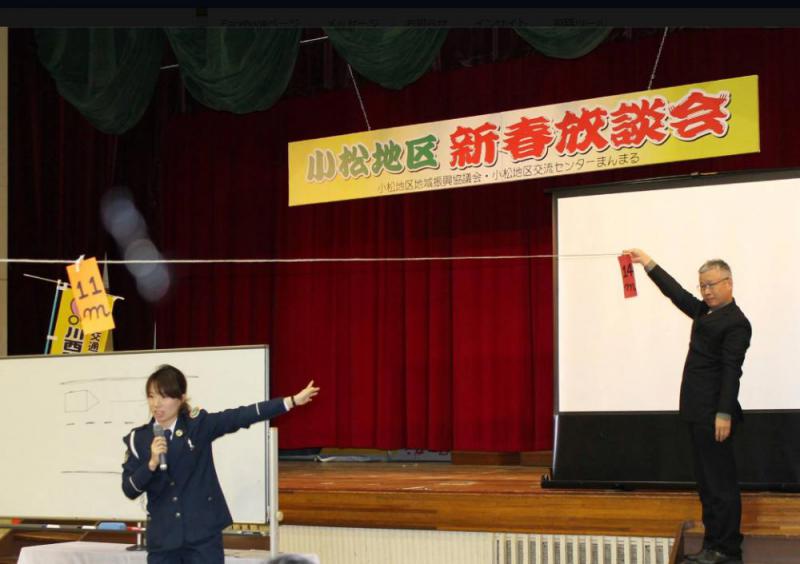 【平成28年 小松地区 新春放談会】1月9日(土)川西町中央公民館にて、毎年恒例の新春放談会を執り行いました。今年は『小松地区交通安全集会』、『小松地区合同研修会』、『小松地区新春放談会』の3部構成としました。『小松地区交通安全集会』では、交通安全専門専門指導員の影澤様を講師としてお迎えし、本年度の交通事故状況や高齢者がどのような交通事故に遭っているのか、分析結果と対応策を説明いただきました。『小松地区合同研修会』では、原田町長を講師としてお迎えし、「共創のまちづくりに挑戦」と題して、これまでの取り組みの総括と今後の展望について講演いただきました。『新春放談会』では、冒頭で、「川西吟友会」のみなさまに詩吟を吟じていただき、終始和やかなムードでお酒を酌み交わし、会話に花を咲かせているようでした。ご臨席いただきましたみなさま、誠にありがとうございました。★★小松の旬な話題は★★★Facebook★小松地区交流センター★youtube