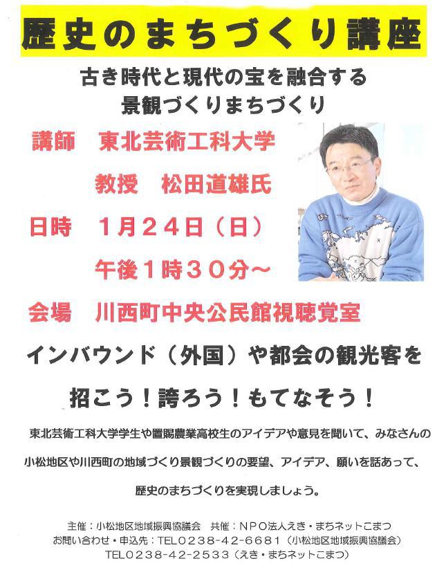 『歴史のまちづくり講座』地域に残る歴史遺産や、生活の一部となっている名所旧関などを新たな視点で洗い出し、地域づくりに活かそう・・「歴史のまちづくり講座」を下記の通り開催いたします。参加は自由・・ご興味のある方はお気軽にご参加ください。◆日時:1月24日(日) 午後1時30分〜◆場所:川西町中央公民館視聴覚室◆東北芸術工科大学学生や置賜農業高校生のアイデアや意見を聞いて、地域づくりや景観づくりの要望、アイデア希望などを話し合って、歴史のまちづくりを実現しましょう。◆詳細は添付画像をご覧kださい。★★小松の旬な話題は「小松地区交流センター」で検索★★★Facebook★小松地区交流センター★youtube