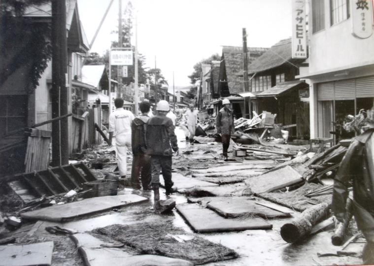 川西町大字上小松字殿原を過ぎるとあら町に入る。この場所、昭和42年8月の羽越水害の記録写真が丸太写真館さんから町の公民館に寄贈されている、ちょうど丸太写真館さんの前から殿原方向を撮ったもの、丸太写真館さんの向かい側はアサヒビールの看板と娘(嵐山酒造の花娘)の文字、そして信平商店の文字が読み取れる、信平商店の看板は下ろされているが、建物は当時のままのようです。 看板の先、今は道路になっているが、古いほうは萱屋根のいさばやさんだったと思います。この前を通るとプーーンとさきいか等のにおいがしたものです。バードは向こう側から手前側に通ってきたのかな。 ここを過ぎると嵐山酒造があり、あと少しで宿泊した西永十さんになります。しかし、昭和42年(1967年)ころまでは、まだたくさん萱屋根の民家があったのに驚きます。なぜか萱屋根はほっとします。