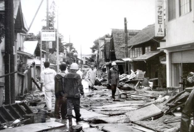 今から49年前のこと、諏訪神社のお祭りの8月26日から降り続いた雨、しゃぎりは出来たが翌27日の獅子踊り、次の28日の神送りは中止となり,その夜、川西町や、小国町をはじめ、新潟・山形両県の4市8町に大きな被害を与えた羽越水害があった、そのとき小学5年、夜、噴水のように床から水が上がってきた、すぐに畳が浮いて歩けなくなり、父は大声で2階に行けと指示がきた、家には1年上の兄とまだ1年生の弟、そして新潟から小学前の従妹2名に伯母とおばあちゃんが遊びに来ていて総勢9人、ガラスの割れる音、家にものがぶつかるどーんという音、電気は消え恐怖を覚えた、家は1階の天井に水がつくと流されると言う、家電で2階に上げたのは当時高級品であった家具調カラーテレビのみ、火事場のばか力で父がひとりで上げたがあとでどうやってひとりで上げれたか覚えが無いという、このときのとうちゃんは頼もしかったのを覚えている、うろたえるおばあちゃんや幼稚園の従妹にたいして父はみんな助けるからと・・ロープを準備しいざとなったらみなロープで繋がって離れないようにするといっていたのを思い出す、夜が明け簡易ボートで自衛隊の人が大丈夫ですかと家々を廻り、人数分の菓子パンをくばってくれて、すごくほっとしたのもよく覚えている、翌日はもちろん学校休み、家は親戚が集まってくれて掃除だった、子供は邪魔になるからと、僕たちは近所を見学していたが家や車が流れていたり、牛や豚の死骸もあった、泥にまみれた街中はぬかみそが腐ったようなにおいがしていた、この水害の後、河川はひろくブロックの護岸となり、水路はみなコンクリートになって行った、治水対策は進んだが近所で見られた蛍も糸トンボもこの年以降高度成長ともあわせ農薬の普及でまったく見られなくなったのである。