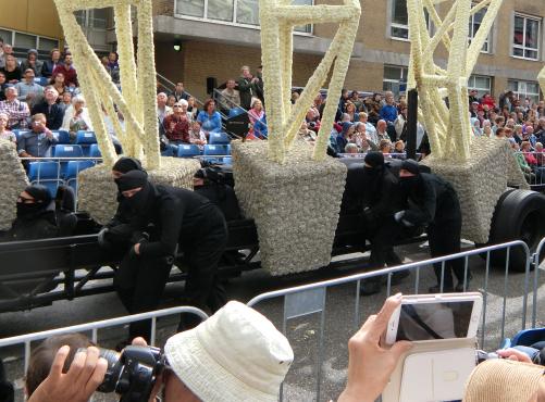 奇抜なデザインの山車の色彩はすべてダリアの花(中輪〜ポンポン咲き)となっており、一面に配置されたダリアの花々のその数に驚きである。総出場数が20体となっており、約1時間30分のパレード、その壮大なスケールに正に夢の世界を見ているような感覚となった。