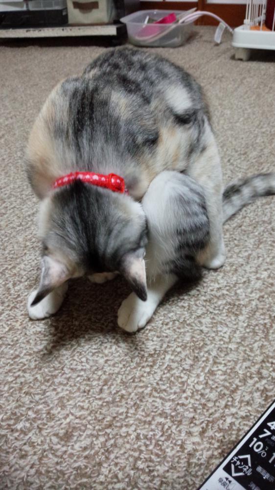 真剣におなかのフワフワな毛を、毛繕いしているにこちゃんです