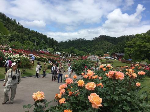 本日のバラの開花状況は、満開です。若干傷んでいるバラもありますが、十分きれいです。園内は人、人、人であふれております。